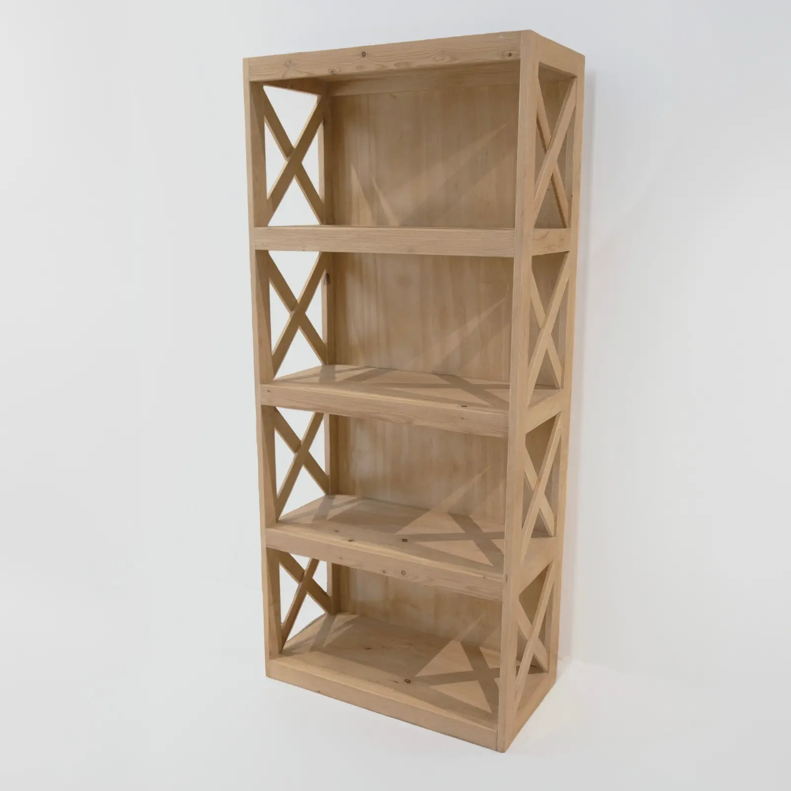With its crossed sides and open shelving, the Rustic Wooden Bookshelf stands out as both functional and visually appealing. Furthermore, its versatile design fits seamlessly in living rooms, studies, or bedrooms, combining structural stability with the warmth and character of natural wood.